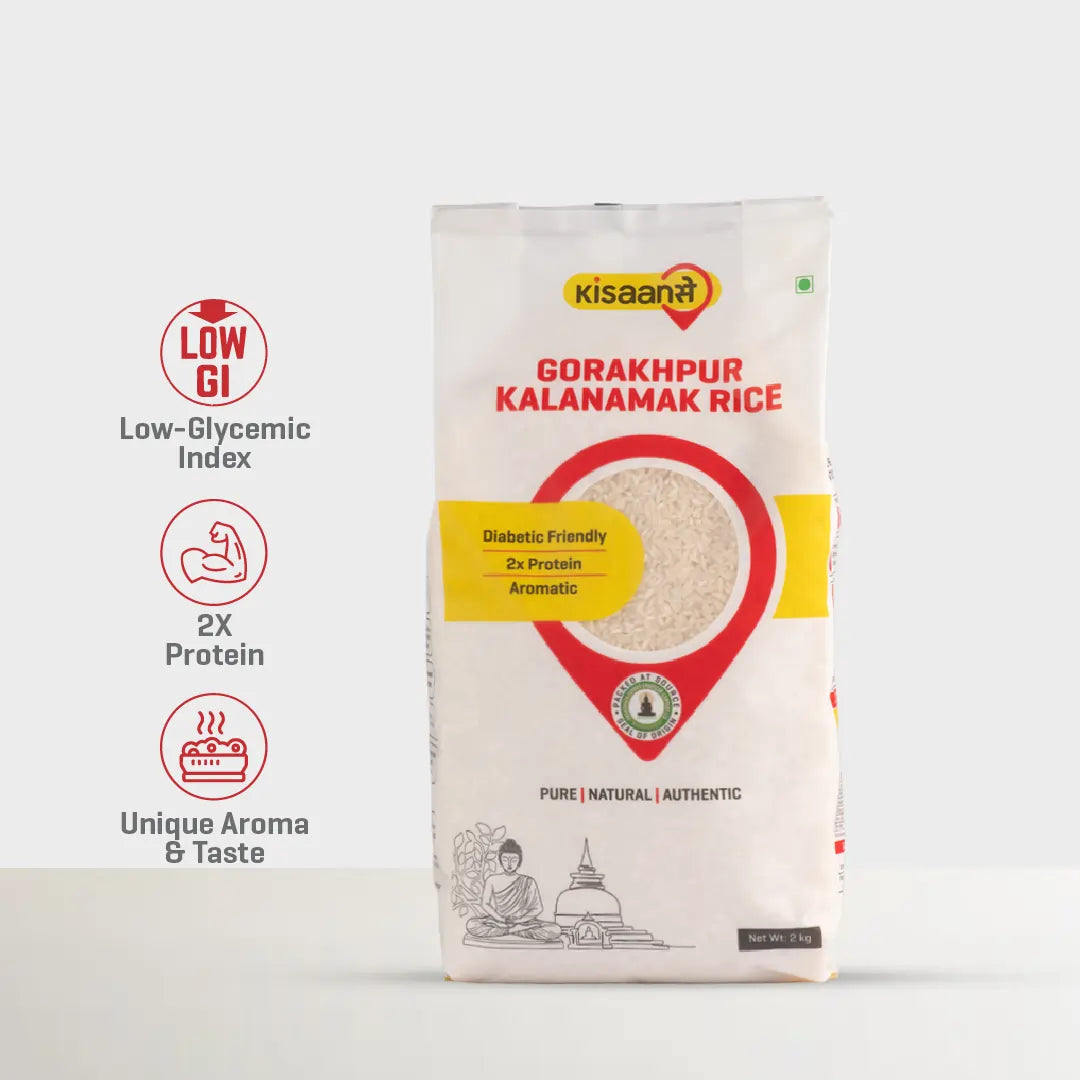 Kalanamak Rice is an exquisite indigenous scented Rice variety, which derives its name from Kala (attributed to the black colour of the paddy) & Namak (attributed to the saline soil where this paddy best grows). When Lord Buddha visited Kapilavastu for the first time after attaining nirvana, he gave this rice as Prasad to the villagers. This wonder rice is a Diabetic Friendly rice, given its low Glycemic Index (Low GI).