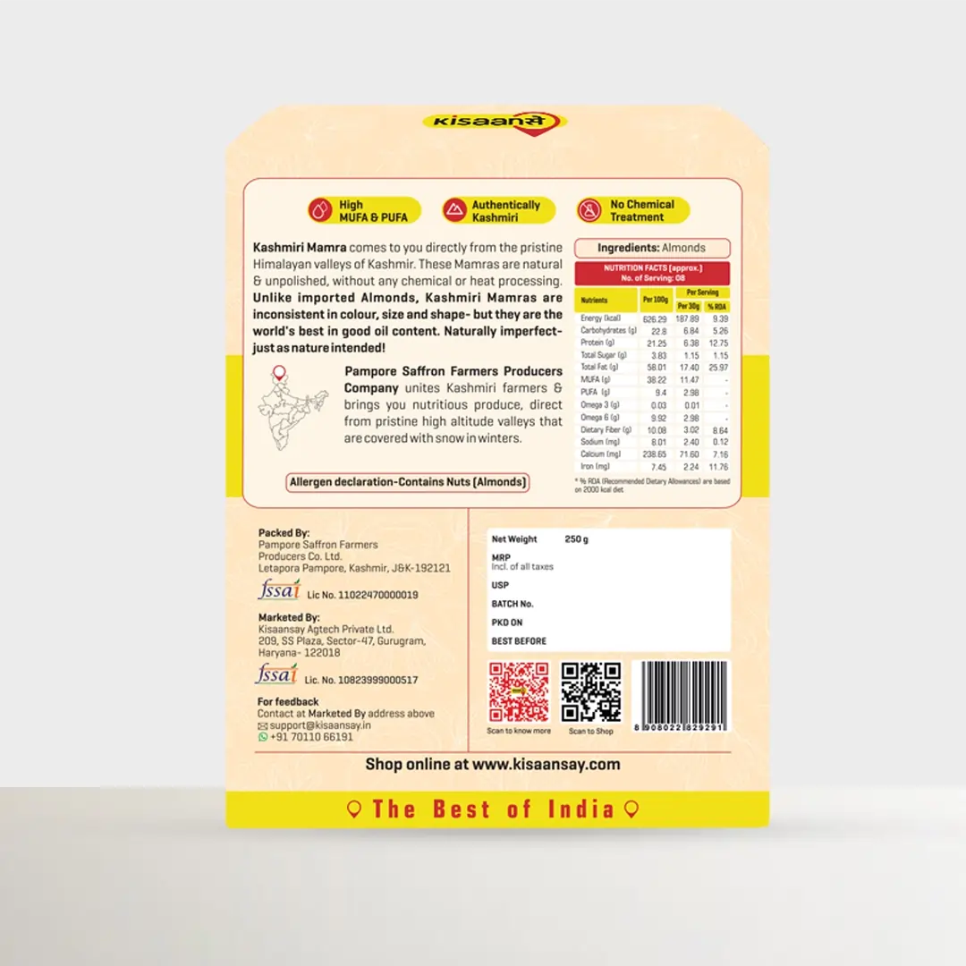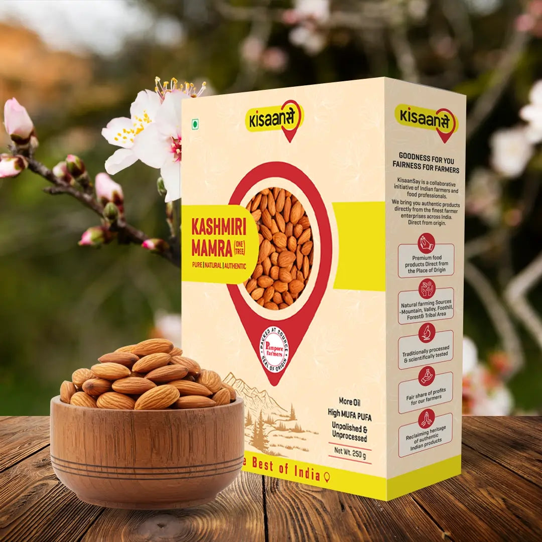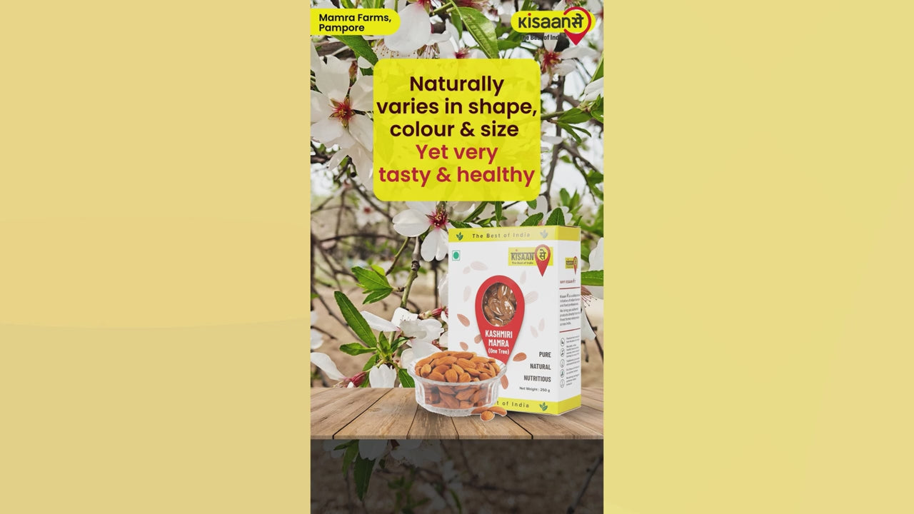 Introducing KisaanSay's premium Kashmiri Mamra, meticulously sourced from the lush valleys of Kashmir for unparalleled quality and freshness. Our almonds are carefully handpicked by local farmers, ensuring excellence in every bite.