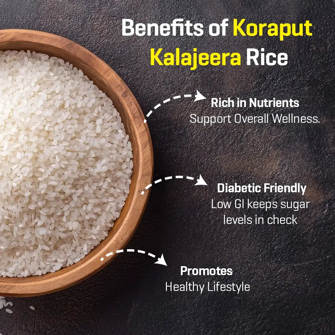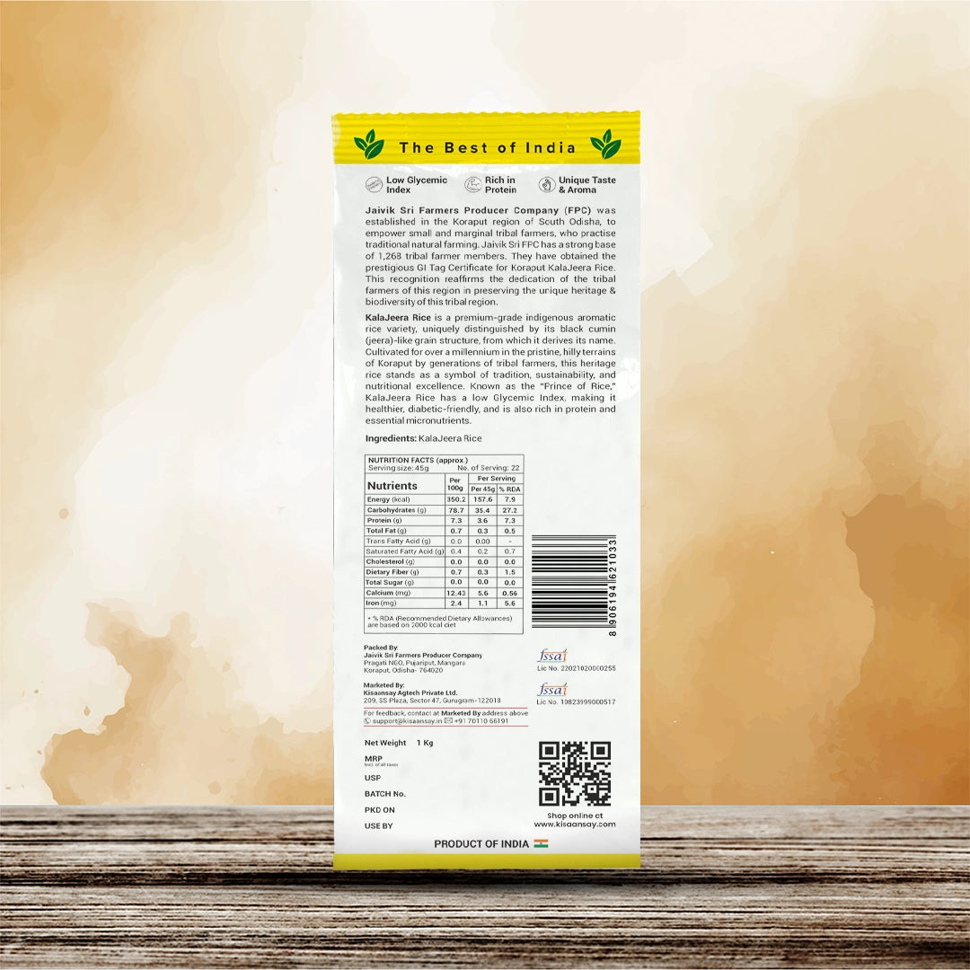 Kalajeera Rice is an exquisite indigenous scented Rice variety, which derives its name from Kala (attributed to the black colour of the paddy) & Jeera (attributed to its small shape and size which is similar to Jeera ) This rice is a Diabetic Friendly rice, given its low Glycemic Index (Low GI).