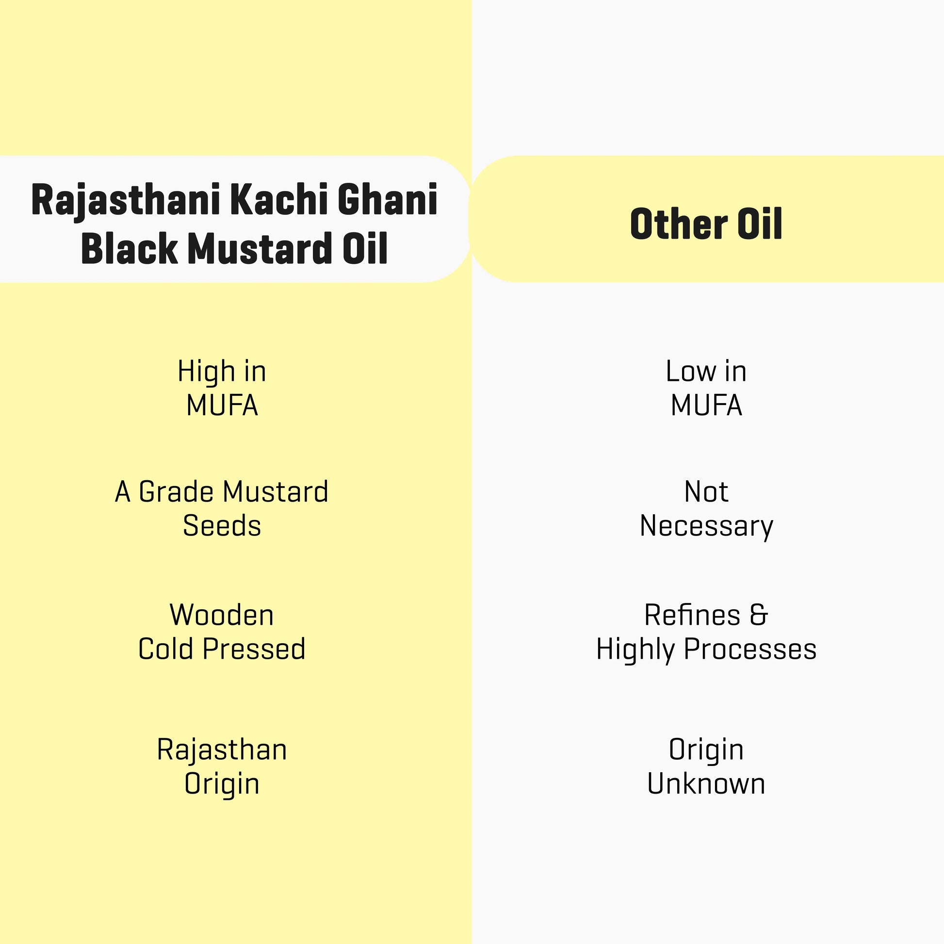 Rajasthani Kachi Ghani Mustard Oil is extracted from A-Grade mustard seeds of Rajasthan, the Mustard State of India. The seeds are traditionally cold-pressed in wooden ghanis. The slow pressing ensures you get the optimal pungency & taste, while ensuring full preservation of vital nutrients, aroma and flavours.