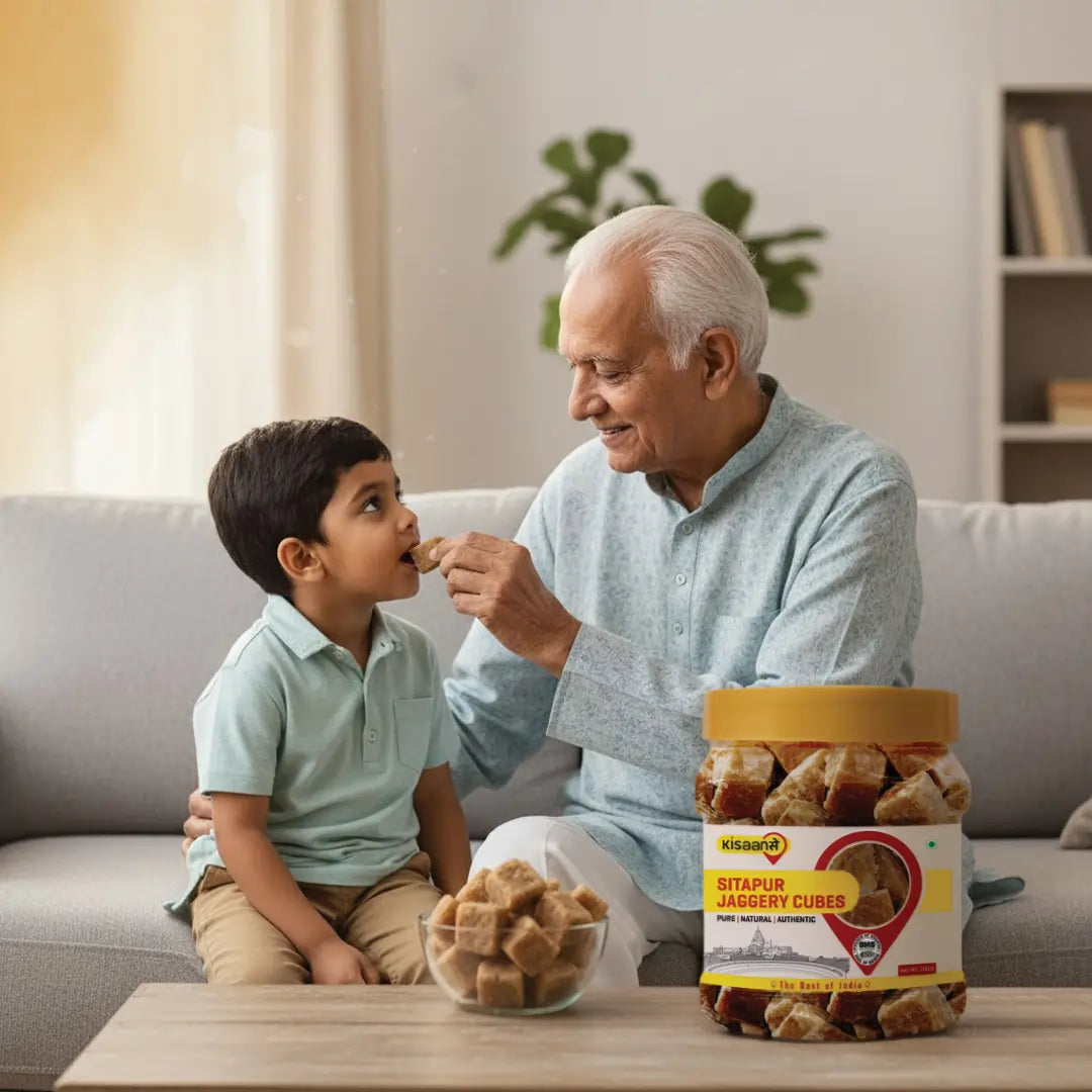 Indulge in the natural sweetness of KisaanSay Ginger Jaggery Cubes- traditionally crafted from the finest sugarcane grown on the banks of the Sarayan River. Blended with naturally grown ginger, these jaggery cubes are sulphur free- to preserve their original purity and authenticity. They are also packed with iron, vitamins, and essential minerals.